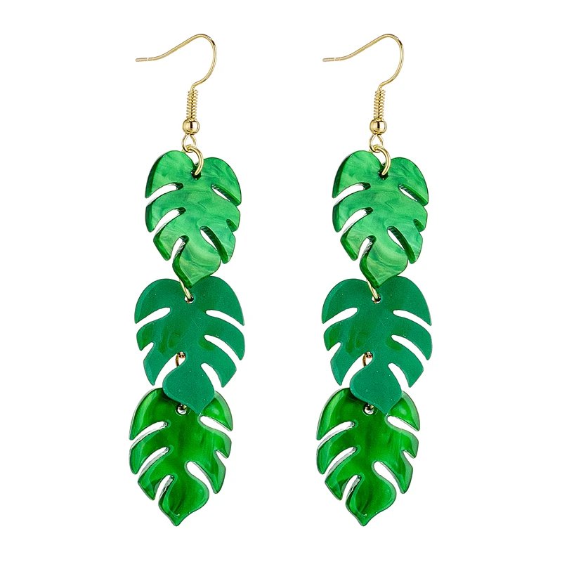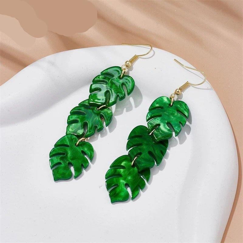 Hechos en acrílico ligero y ensamblados en forma de cascada articulada, cada movimiento revela su silueta tropical. Cuentan con ganchos metálicos en dorado cálido, cómodos para uso diario o para dar un toque verde a cualquier look.